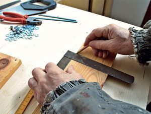 - Na nařezaných dílech si vyměříme místa pro otvory na protažení závitových tyčí. Budou v rozích prkének