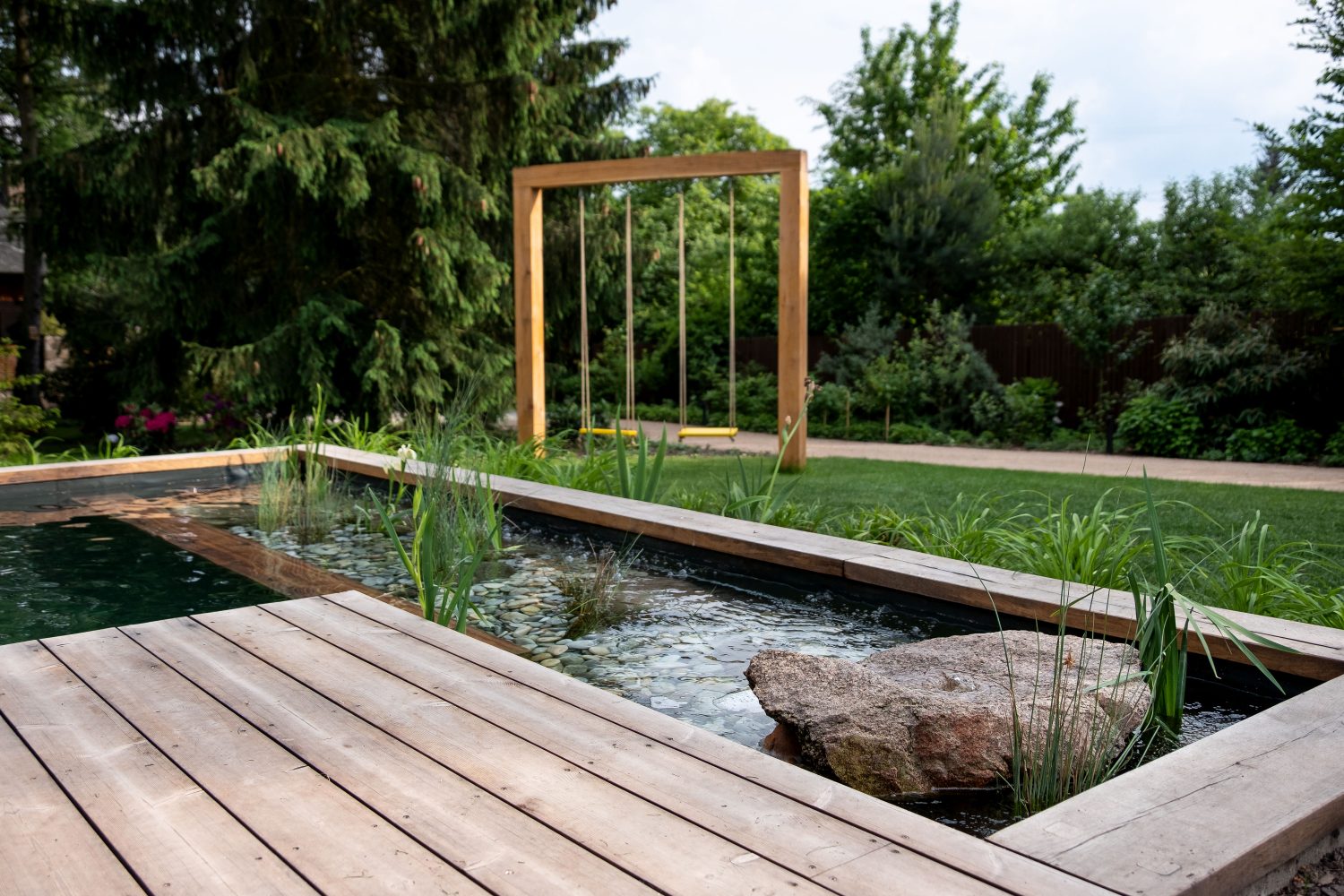 K přírodě vstřícný přístup se promítá i do zálib, jako je koupání v bazénu. Na ten, v němž vodu udržuje čistou chemie a v zahradě působí jako umělý prvek, bychom ale měli zapomenout. Zříkat se koupání rozhodně nemusíme. Řešením je tzv. biopool, tedy bazén, v němž se voda čistí biologickou cestou. Kromě toho, že je ekologický, nehrozí po pobytu v něm jedincům s citlivější pokožkou alergické reakce. Pokud to velikost pozemku dovolí, je z ekologického hlediska vhodnější vybudovat u chat a chalup namísto septiku kořenovou čističku.