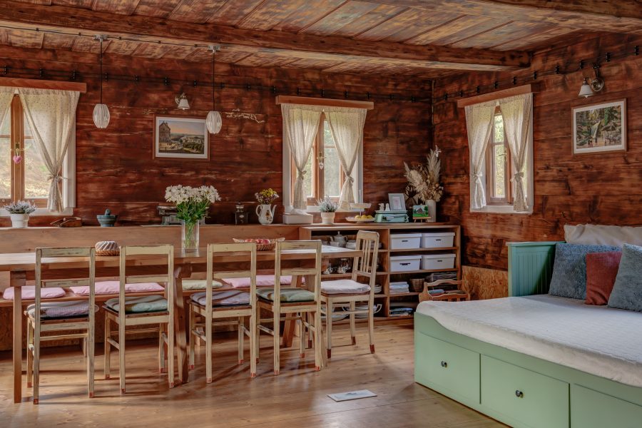„Chtěli jsme zachovat jejího původního ducha, abychom se v ní cítili opravdu jako za starých časů. Zároveň se nám líbilo, že nabízí komfort v podobě nové kuchyně nebo dostatečný počet koupelen. V přízemí se žije – velká světnice propojuje kuchyni, jídelnu a obývací prostor a slouží jako místo, kde se tráví čas od rána do večera.“ Je tu dost místa i díky tomu, že velkou technickou místnost využili nejen jako místo pro pračku, sušičku i druhou chladničku, ale nabídla i spoustu úložného prostoru. V chalupě je moderně zabydlené podkroví, kam vede nové schodiště. Schody do prvního patra se zachovaly původní a bez jejich líbezného vrzání si to už v chalupě nikdo nedovede představit. Ložnice jsou tedy ve dvou podlažích, každé patro má svou koupelnu s toaletou. Právě koupelna v podkroví byla jedním z míst, které potřebovalo úpravy, konkrétně se tam dodělával sprchový kout. Předloni také upravovali koupelnu v přízemí, kde přibyly po celé stěně obklady.
