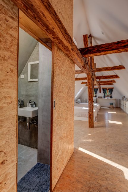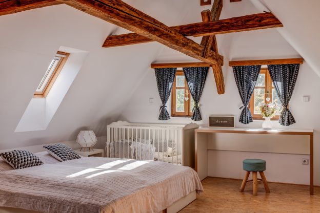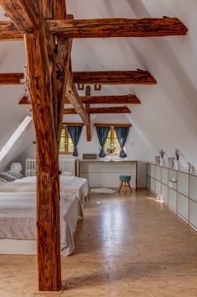 V podkroví chalupy vznikla velká ložnice s koupelnou. Okénka v krovu nahoře jsou funkční, foto: Se svolením Romany Bennet a Kateřiny Kuranové