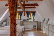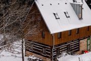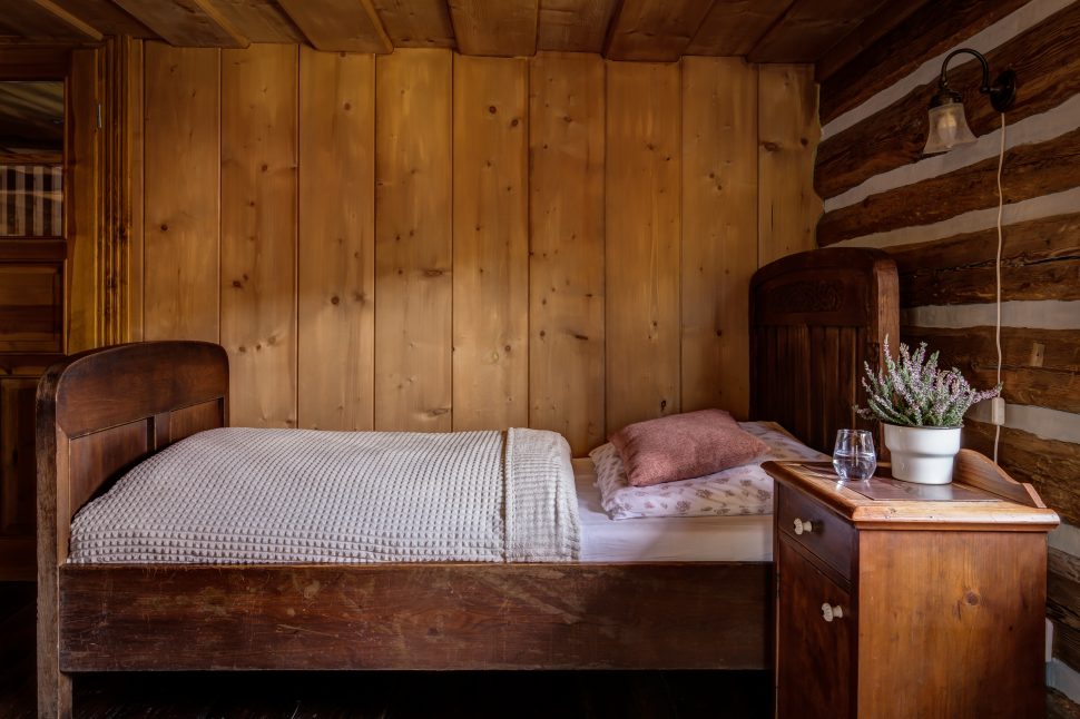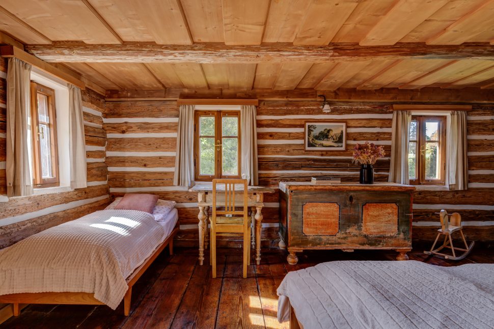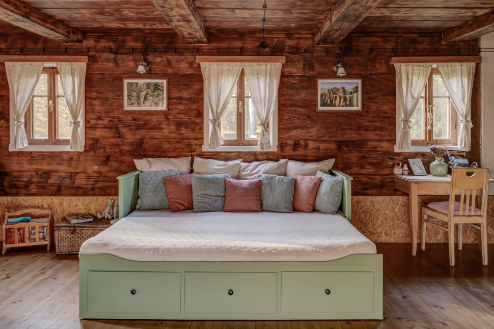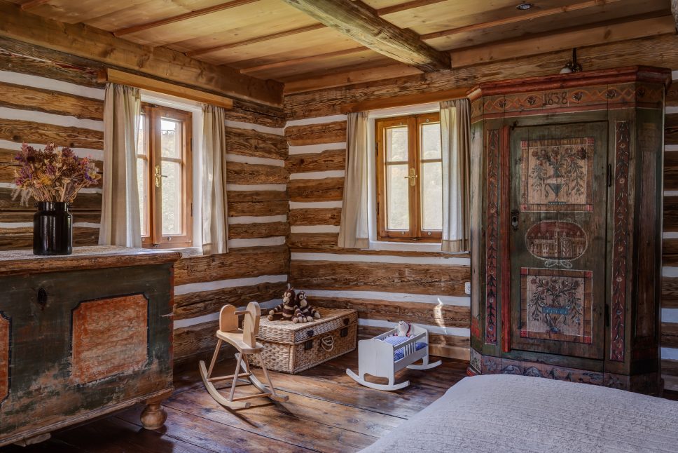 Charakter chalupy vytvářejí letité trámy, staré podlahy a malované skříně. „Většina nábytku už na chalupě byla, my jsme pouze doplnili jednu postel a starou skříň do ložnice v prvním patře,“ popisuje Klára. Majitelé mají rádi kombinaci starého s novým, patrné je to především ve světnici: „Nová kuchyně umožňuje zachovat novodobý standard při vaření, zatímco zbytek světnice evokuje starou chaloupku,“ pochvaluje si Klára. Zajímavým prvkem jsou OSB desky. „Líbí se nám jejich využití v podkrovní ložnici – jednak na podlaze a taky jako vnější obklad koupelny. Dole ve světnici měly pravděpodobně praktickou krycí funkci. Tam jsme je ale nově zakryli klasickou omítkou, protože se nám tam moc nehodily,“ vysvětluje Klára.