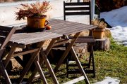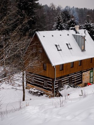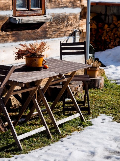 Do čeho se mohli majitelé z gruntu pustit, byla zahrada. „Udělali jsme ji celou,“ pochvaluje si Klára. „Jako první se dělala stráň za Vejminkem. V této části nebylo původně nic, nově tam vznikla cesta směrem do kopce na louku, tak i zkratka po schodech. Letos jsme dodělali i zadní část za chaloupkou, kde je nově dlažba, a taky přední část zahrady s novým dřevníkem.“ Když vyjdete úplně nahoru nad chalupu, je tam lavička, na které se dá ležet a užívat si výhled na louky a vrch Studený. Díky tomu, že chalupa stojí na kraji obce, je krásně obklopená přírodou.