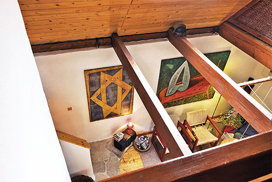 Pěkný průhled z pracovny do přízemí, kde mezi „vývozními“ trámy vidíme obrazy Aleše Knotka, který chalupaří v nedaleké vsi