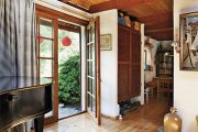 Chaloupku dnes bohužel nelze z nevelké zahrady, zarostlé stromy a keři, vyfotografovat celou; tady je vidět část s prosklenými dveřmi