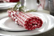 Hezkým detailem na slavnostně prostřeném stole jsou ubrousky. Mohou být látkové i papírové a barevně by měly ladit s celkovou výzdobou. Ubrousky nenecháme jen tak položené, ale vtipně je naaranžujeme. Můžeme je složit do podoby květů, vějíře i jiných tvarů. Tradiční úpravou je srolovaný ubrousek zasunout do kovového, porcelánového nebo dřevěného kroužku. Pokud ho nemáme, můžeme vyzkoušet použít i netradiční předměty, které lze na ubrousek navléknout. Zajímavě bude na ubrousku vypadat například vykrajovátko na vánoční pečivo, kroužek z navléknutých korálků nebo knoflíčků na gumičku, věneček z drobných umělých kytiček a podobně. Ubrousek i s příborem můžeme převázat barevnou stuhou, na kterou připevníme perníček, drobnou vánoční dekoraci nebo smrkovou větvičku.
