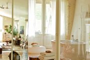 Nejoriginálnější místností je bezpochyby vyvýšená koupelna. Je velmi prostorná a díky obrovské skleněné stěně, která ji dělí od ateliéru, prostoupená slunečním světlem. Konstrukce přepážky pochází z dílny belgické firmy Philip V.