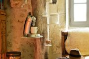 Jak velí tradice, zdi jsou jen hrubě opracovány, aby byly vidět stavební kameny včetně vápenné malty. Co se podlah týče, náš pár si do vstupní místnosti a kuchyně vybral modrý kámen pocházející z Belgie a do obývacího pokoje, ateliéru a koupelny zvolil místní světlý kámen. V ostatních místnostech byly položeny parkety.