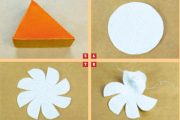 - Uděláme si papírové šablony na pomerančový plátek – tři kružnice s poloměry 3,5 cm, 3 cm a 2,5 cm, které pak přeložíme na půl. Podle největší a nejmenší šablony stříháme díly ze světle oranžové plsti, podle prostřední z bílé. Nejmenší díl ještě rozstříháme na pět trojúhelníků