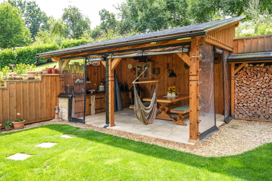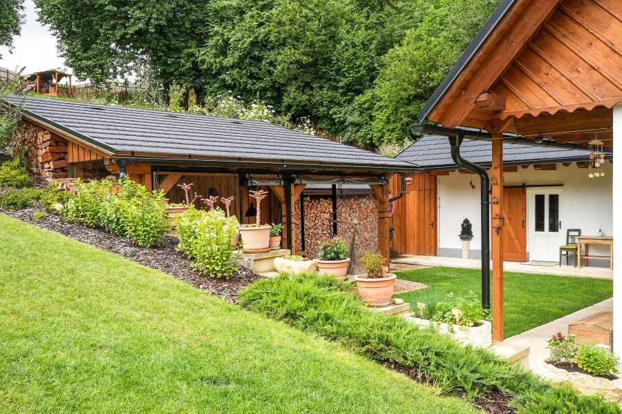 O tom, že práce kolem domu Ladislava opravdu baví, svědčí i perfektně upravená zahrada. Sklon pozemku skýtal mnoho výzev, majitel je ale ve spolupráci s místní zahradnickou firmou dokázal proměnit v přednosti. Zatímco přední část pod zápražím je osázená okrasnými jehličnany, travami i kvetoucími trvalkami, prostor bezprostředně za domem tvoří uzavřený dvůr, který se po většinu roku stává plnohodnotnou místností. Dominuje mu přístřešek s venkovní kuchyní, grilem a posezením, kde je díky snímatelným zástěnám příjemně po celý rok. Nechybí ani zázemí pro odpočinek v podobě sauny a vytápěného koupacího sudu. Další část zahrady, kterou přirozeně odděluje terénní převýšení, má tradičnější charakter se starou jabloní a ovocnými keři a nabízí kouzelné výhledy do okolní krajiny.