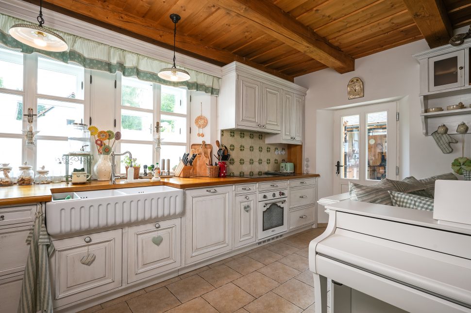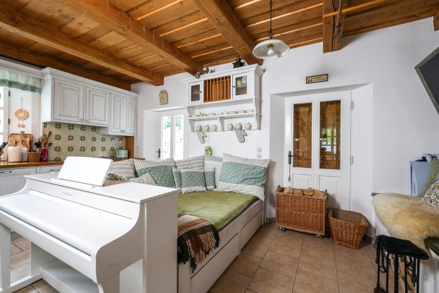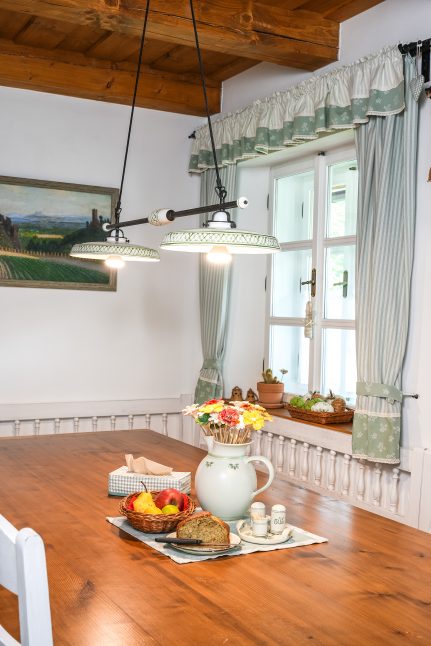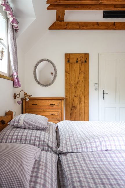 Na řadu pak přišlo zařizování interiéru. Také ten se měl držet chalupářského stylu a připomínat staré časy. „Chtěl jsem, aby se tu kamarádi a známí, co sem v létě přijedou, cítili jako na prázdninách u babičky,“ vysvětluje Ladislav. A tak se v chalupě spí v kanafasovém povlečení a stoluje s puntíkatým nádobím. Kuchyňskou linku z masivního dřeva nechal Ladislav vyrobit na míru u firmy Artstyle, stejně jako další nábytek ve světnici i v ložnicích. Najdete tu ale plno drobných detailů, které atmosféru dotahují k dokonalosti. Každá místnost má svou jasně danou barevnost a vše od závěsů po polštářky k sobě dokonale pasuje.