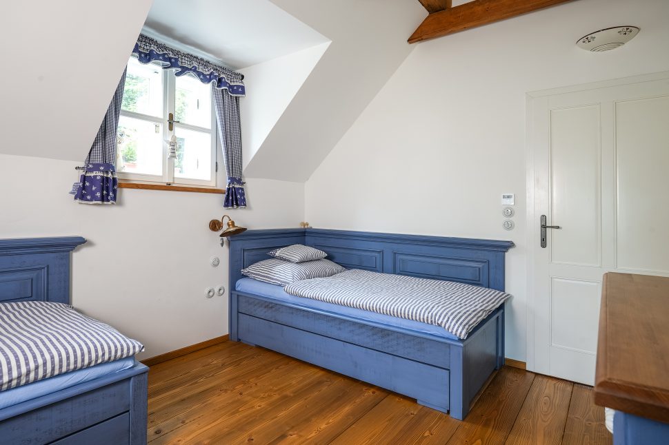 Ložnice v patře kombinuje modrý nábytek se vzorovaným povlečením v téže barvě, foto: Vladimír Hájek