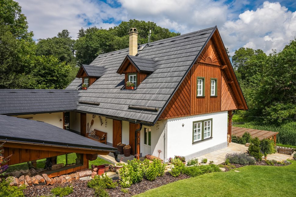 O tom, že práce kolem domu Ladislava opravdu baví, svědčí i perfektně upravená zahrada. Sklon pozemku skýtal mnoho výzev, majitel je ale ve spolupráci s místní zahradnickou firmou dokázal proměnit v přednosti. Zatímco přední část pod zápražím je osázená okrasnými jehličnany, travami i kvetoucími trvalkami, prostor bezprostředně za domem tvoří uzavřený dvůr, který se po většinu roku stává plnohodnotnou místností. Dominuje mu přístřešek s venkovní kuchyní, grilem a posezením, kde je díky snímatelným zástěnám příjemně po celý rok. Nechybí ani zázemí pro odpočinek v podobě sauny a vytápěného koupacího sudu. Další část zahrady, kterou přirozeně odděluje terénní převýšení, má tradičnější charakter se starou jabloní a ovocnými keři a nabízí kouzelné výhledy do okolní krajiny.