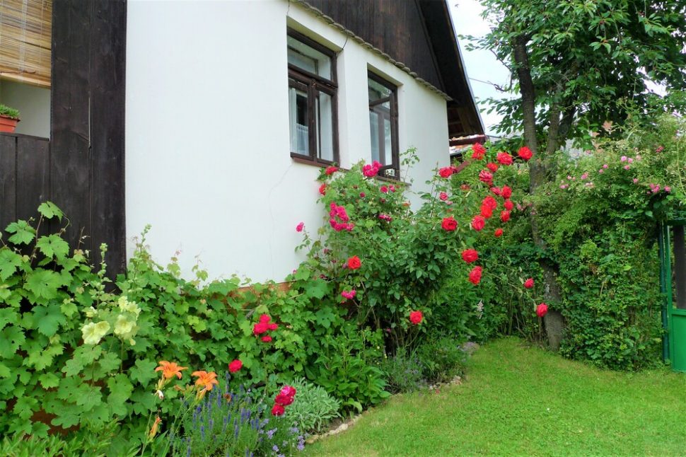 Hned u vstupu na pozemek je vám jasné, že mezi favoritky paní domu patří růže. Růžové se pnou kolem zeleně natřené branky, krásný keř sadové odrůdy Andělská červená zdobí bílou omítku pod okny a další cihlové, růžové a bílé květy keřových růžiček vidíme v bujné skalce. Jsou tady také různé formy třapatek, lilie a bylinky, šalvěj, tymián, rozmarýn, yzop lékařský a dobromysl.