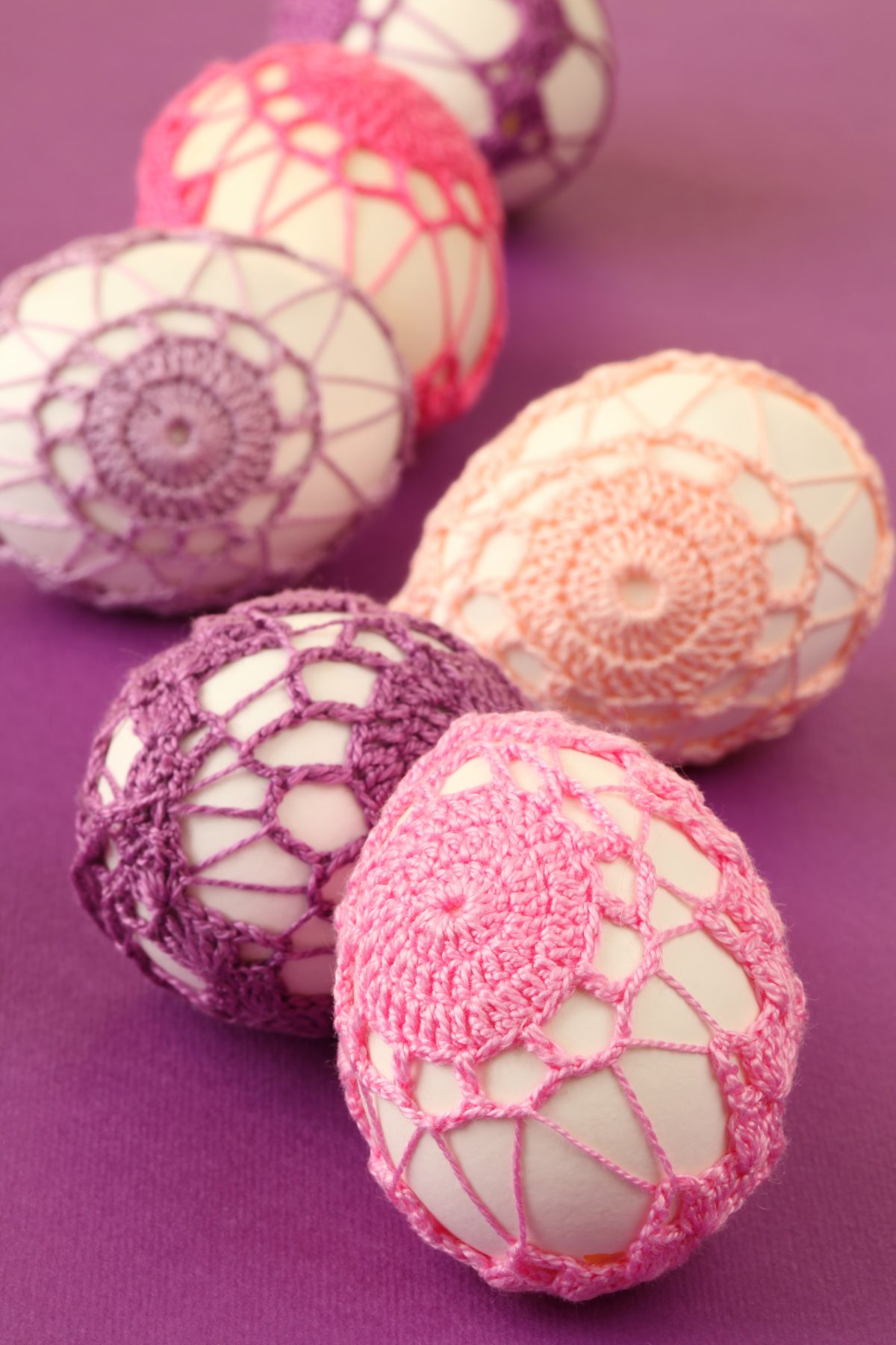 Pro ozdobení vyfouknutých vajec se hodí například barevné příze a vlny. Můžeme jimi vajíčko obháčkovat, buď něžným krajkovým vzorem, nebo hustými sloupky. Barevnými vlnami se dá celé vajíčko také ovinout, buď hezky nitku vedle nitky, nebo cik-cak. Předtím ale na skořápku postupně nanášíme lepidlo, abychom vlnu zafixovali. Pohrát se dá i s nalepováním vlněného rouna do vzorů.