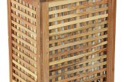 Koš z ořechového dřeva s vyjímatelným textilním pytlem, připevněným suchými zipy, rozměry 52 x 37 x 65 cm, cena 890 Kč (vyrábí Multi, prodává SiKo)
