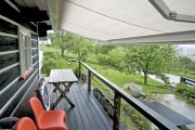 „Pořídili jsme ji po strašně dlouhém váhání,“ přiznává Jan. „Je umístěna pod dřevěným okapem, schovaná za bílým plechovým ‘trámem’. Elektrické ovládání je nad schůdky do zahrady,“ ukazuje na bílou skříňku. „Instalovali jsme k chalupě něco, co sem filozoficky nepatří, ale rozhodně nelitujeme. Jen se ještě rozhoduji, zda nemám trám okapotovat ručně opracovaným dřevem,“ dumá pan architekt.