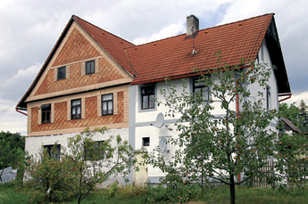 K tradiční chalupě na druhém obrázku se nehodí plastová okna ani krytina a obklad z bonského šindelu. Sem patří špaletová okna a když je to možné, tedy i podjímané sklo zasunované do frézovaných H profilů bez tmelu a upevňované kolíčky v přeplátovaných rozích. Originální zřejmě není ani valbička.
