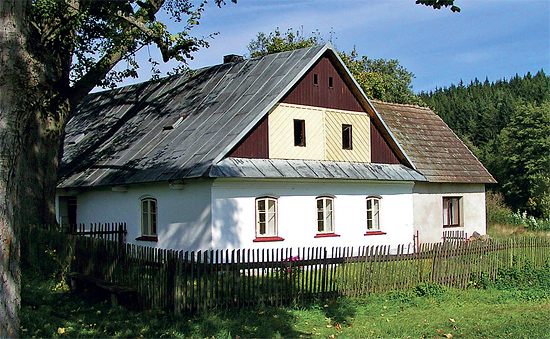 Co chalupě příliš nesluší, je krytina střechy z tabulového plechu. Dojde-li ke změně, chtělo by to krytinu skládanou. Lépe vypadají staré betonky, které zůstaly na přístavku. Skládaná lomenice se asi renovovala ve stejné době jako střecha. To už se používala užší prkna, prvek, který je ještě patrnější na barevně odlišené části ve středu. Dřevo by se rozhodně mělo barevně sjednotit. A ještě lépe – na takhle pěkné chalupě by měla být lomenice z alespoň dvaceticentimetrových prken. V současnosti by prospělo i přelištování ob jednu spáru. Okna v novém dřevě by měla mít nějaké orámování, alespoň takové, jaké vidíme kolem okének v tmavém dřevě nahoře. Důležité je také jejich členění. Tabulky horních oken by vždy měly být menší než v oknech v přízemí.
