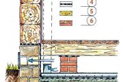 Nabízíme několik řešení. Na obr. č. 1 je řez roubenkou, postavenou ve vlhkém terénu. Aby nebyl nijak narušen starobylý vzhled zvenčí, zvolíme všechny úpravy uvnitř. Kromě jediné, což je vyvedení vnitřní drenáže kolem základů ven do terénu, co nejdál od chalupy. Nová podlaha, uložená na trámech (smrk, borovice, průměr asi 18 -25 na 14 – 18 cm), je přibita, lépe přišroubována vhodně dlouhými samořeznými vruty s plochou zapuštěnou křížovou hlavou. Tepelná izolace je uložena mezi trámky.
