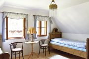 Vystoupáte-li s trochou obezřetnosti po strmých schůdcích do podkroví, najdete tam dvě další světlé a dostatečně prostorné ložnice. Obě poskytují doslova velkolepý výhled do krajiny skrze okna ve štítech a pro jejich případné samostatné vytápění slouží stylová finská kamna.