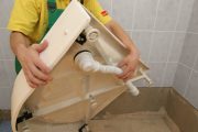 Necháme lepidlo zatvrdnout. Po zatvrdnutí lepidla vaničku ještě sejmeme a zkontrolujeme těsnost všech spojů. Poté definitivně vaničku nasadíme na odpadní potrubí. V případě pevného odpadního potrubí ji nasadíme pomocí tvarového kroužku na odpadní sifon. Oba díly zevnitř sešroubujeme (šroubem nebo napojovacím kusem a speciálním klíčem).