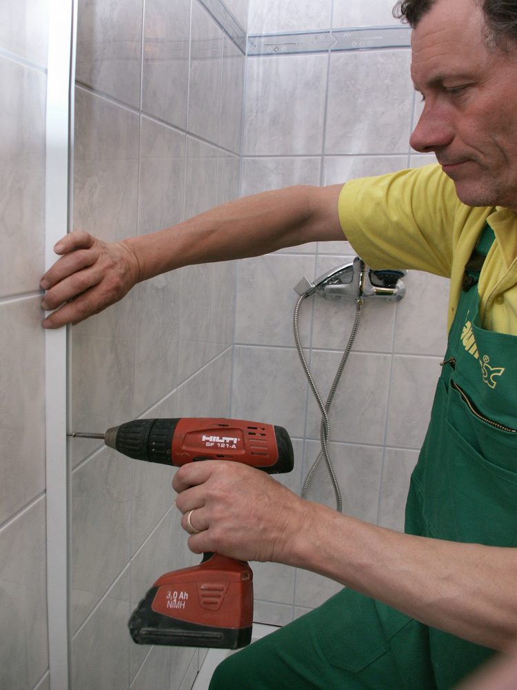 Přesně usazený sprchový kout upevníme šrouby do svislých U-profilů na stěnách. Dále zbývá zabezpečit sprchový kout proti vodě.