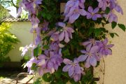 Vzhledem k tomu, že by klasické zastřešení terasy značně omezilo přísun světla do interiéru, přišla architektka s řešením formou představené pergoly, která chrání před sluncem i případnými nežádoucími pohledy z ulice. Nechala ji porůst opadavou vistárií, která v zimním období nebrání prostupu slunečních paprsků okny, v létě však poskytuje kýžený stín, když celou terasu promění v pokoj se zelenými stěnami. Každé jaro se navíc vyšňoří záplavou hroznovitých květenství, jež postupně nahradí sladce voňavé květy pnoucí růže, které zdobí rovněž nedalekou treláž vztyčenou nad studní. O tom, že se vistárii, byť na severní straně, ale na chráněném místě daří dobře, svědčí i to, že ji musí majitelé průběžně zastřihávat během celého vegetačního období.