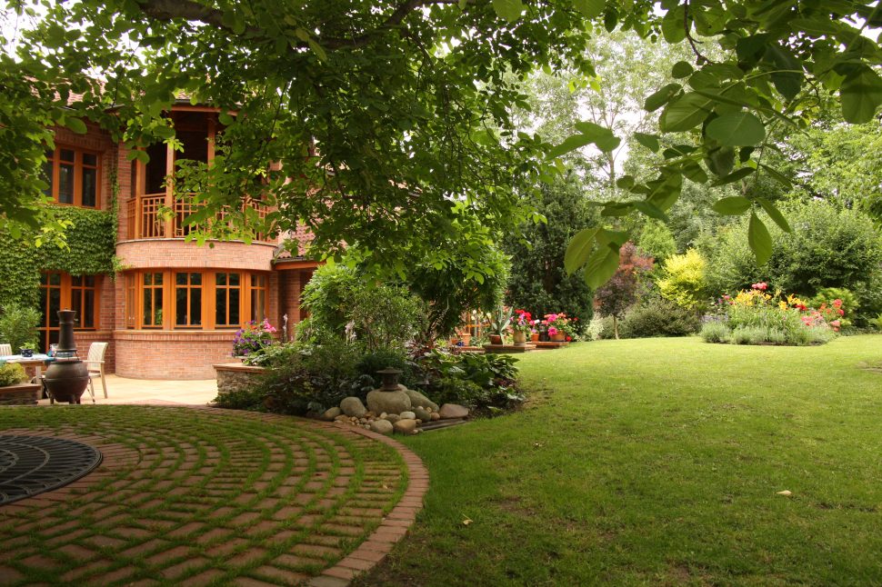 Vzrostlý strom má ještě jednu symbolickou funkci – dělí pozemek na dvě odlišné poloviny. Zvýšené partie za domem oplývají stinnými zákoutími a také velkou trávníkovou plochou. K osvěžujícímu mikroklimatu tu přispívají buxusy, bobkovišně, kapradiny, čechravy, hosty, barvínek, a také badany, dlužichy, hortenzie a břečťan. Zjara tu z trávníků vyraší spousta krokusů, ladoněk, narcisů a dalších cibulovin.