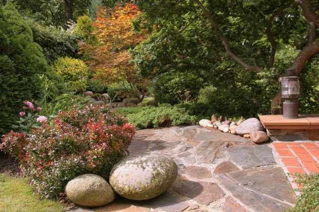 Okraje záhonů lemují zapuštěné ploché břidlicové kameny, nalezené při zemních pracích během výstavby domu. „Usnadňují údržbu záhonu při sekání trávy, navazují na ostatní zpevněné kamenné plochy a zálivy z oblázků a poskytují také útočiště nižším koniferám menšího vzrůstu a půdopokryvným keřům,“ vysvětluje majitelka. „Vytěžená břidlice vystačila i na výstavbu opěrných zídek kolem níže položené terasy.“