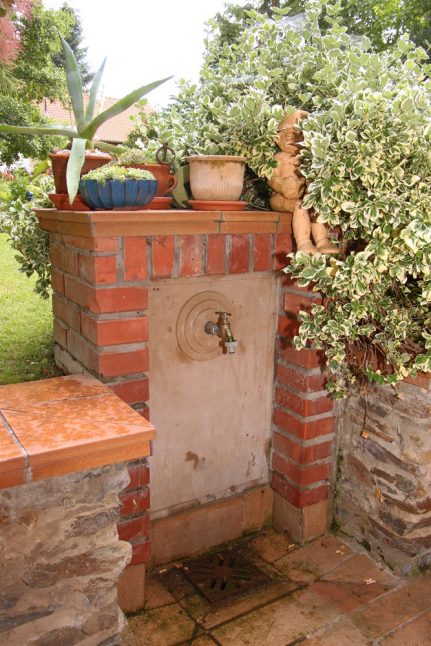 „Kolem pozemku se zachovalo staré oplocení, tvořené pásem kamenných zdí někdejšího hospodářského stavení, dřevěná branka a stará pumpa nad kamennou studnou, odkud je nyní čerpadlem rozváděna voda pro zálivku. „Stačilo se dívat a navázat na to, co jsme tu už měli.“