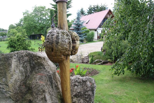 „Strom byl nemocný, měl nádor, tak se bratr zamyslel, trochu na dřevě zapracoval a výsledek je skulptura, kterou všichni obdivují,“ usmívá se majitelka.