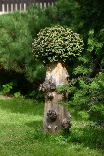 Zajímavým vynálezem a ozvláštněním pozemku jsou i dřevěné žardiniéry. Jsou vytvořené z vykotlaných a řezbářsky opracovaných pařezů posazených na dřevěných nohách či na nízké kulatině. Paní domu je osázela afrikány, netřesky, vřesy, ozdobnými travinami. Některé z nich krášlí i několik pavích per.