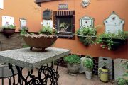 Z hrnkových květin, jak je patrné hlavně na předním dvorku, má Jana nejvíc v oblibě muškáty. Usadily se v kamenných korytech i v netradičních květináčích – výlevkách, které zdobí celý tenhle prostor. „Několik prvních jsme si přivezli ještě z Libně, kde jsme zpočátku s Honzou bydleli. Bouraly se tam baráky, takže jsme je vlastně zachránili. Další jsme objevili na smeťácích a některé nám donesli úplně cizí lidi,“ vysvětluje Jana. Ty, na nichž smalt ještě drží, nechá tak, jak jsou, rezavé očistí a natře. Trpělivě oprašuje i staré kamenné valchy, šicí stroje, mlýnky a další předměty, které Pacák, jak občas říká, sbíral. A vytvářel.