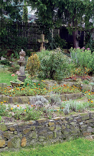 O květiny a zeleninu tedy pečuje Jana. Už je sice v penzi a má víc času, ale v posledních letech přišly problémy s páteří. Proto se na záhoncích rozrůstají hlavně nenáročné trvalky. „Něco za mě řeší příroda sama. Loni v zimě zmrzly růže, které jsem kombinovala s levandulí, a zmizely i floxy, což mě mrzí. Ty jsem měla moc ráda. Dosadila jsem jenom levanduli. Takže to je celkem jednoduché: zjara mi dělají radost sněženky, tulipány a narcisy, pak zlaté a tmavě hnědé denivky. Růžovou přidá mandloň v rohu skalky. Po cibulovinách naseju afrikány, kterým dělá pozadí rozchodník a vajgélie. Pak už rozkvétají malé fialkové astřičky neboli posvícení a je tady podzim.“