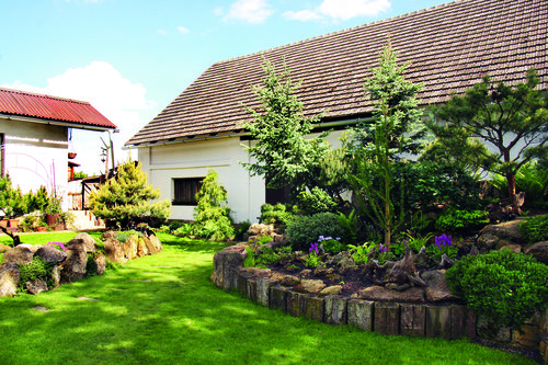 Stopy lásky majitele pro japonský styl výsadby se tu přece jen najdou – pan Jirka má rozsáhlou sbírku bonsají, miluje jehličnany. Pro zahradu a její výsadbu je také charakteristické zarámování jednotlivých partií – skalek, jezírek a náspů – do kamene. Objevíte zde i neobyčejné množství tarásků, zídek a rabátek, z nichž jsou zbudovány zahradní ostrovy. Pan Jirka vysvětluje, že se především snažil pracovat s materiálem, který byl nejdostupnější. „V okolí je dostatek pískovce, některé opracované kameny jsme získali z podezdívek zbořených statků. Když kámen docházel, používali jsme i pražce.“