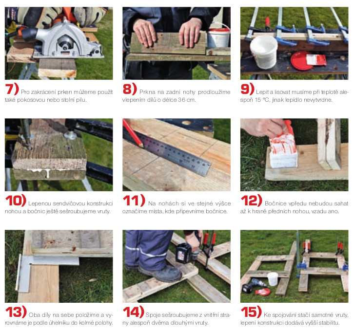 Tloušťka prken standardní europalety je 22 mm. My potřebujeme na základní konstrukci tlustší prkna, proto si pomůžeme spojením dvou kusů lepením a sešroubováním. Zadní nohy jsou vysoké 156 cm, nejdelší prkno europalety má jen 120 cm. Nevadí, opět si pomůžeme sendvičovou konstrukcí s vzájemným přeložením prken o 36 cm a doplněním materiálu na obou koncích (viz postup).