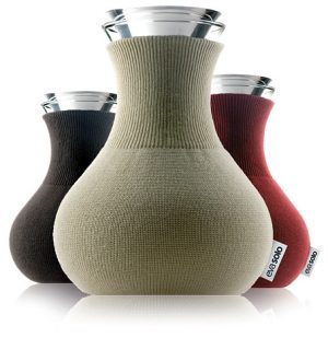 Takovou slušivou textilní nebo pletenou ochranu pro konvici si můžou šikovné chalupářky vyrobit samy nebo ji i koupí hotovou. Moderní skleněné karafy na horké nápoje zas například designérka Eva Solo oblékla do těsně přiléhajících elegantních vlněných „pulovrů“ nebo kabátků na zip.