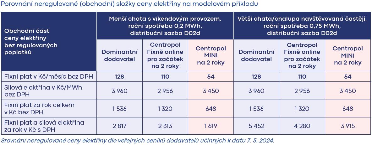 Pro rekreační objekty je zajímavá takzvaná víkendová distribuční sazba D61d, kdy je od páteční 12. hodiny do nedělní 22. hodiny účtován NT a po zbytek týdne běží VT. V té době je ale obvykle v odběrném místě jen zanedbatelná spotřeba, takže v režimu VT dochází k minimálnímu odběru elektřiny. O takové distribuční sazbě uvažujte, jestliže je vaše chata či chalupa v permanenci převážně jen o víkendech. A pro takové je smlouva s Centropolem na produkt MINI na 2 roky nejlepším řešením.